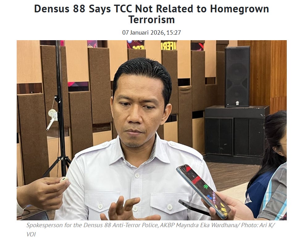 Jakarta’s anti-terrorism police unit determined online activity of the 112 TCC-involved students they investigated was not connected to ISIS or formal terrorist groups. According to the police spokesman, TCC is purely a phenomenon of global violence that develops in the digital space and has no direct relationship with domestic terrorist networks. If you missed it last year, here is my explanation of the difference between political violence, mass shootings, and terrorism.