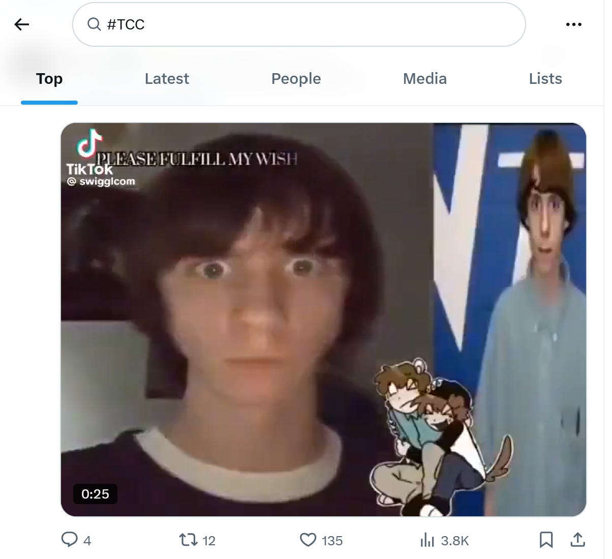 These new risks aren’t theoretical. Here is an example from a mainstream social media app where a teen is using a TikTok bubble filter to try to look like Adam Lanza. When algorithmic apps reward fringe, offensive, and controversial content, this random account got +100 likes in the first hour when I screenshotted this. Since twitter and meta have no trust/safety teams or content review process, anyone can post, share, and like this content. As you can see in the search bar, TCC content is easy for anyone to find.