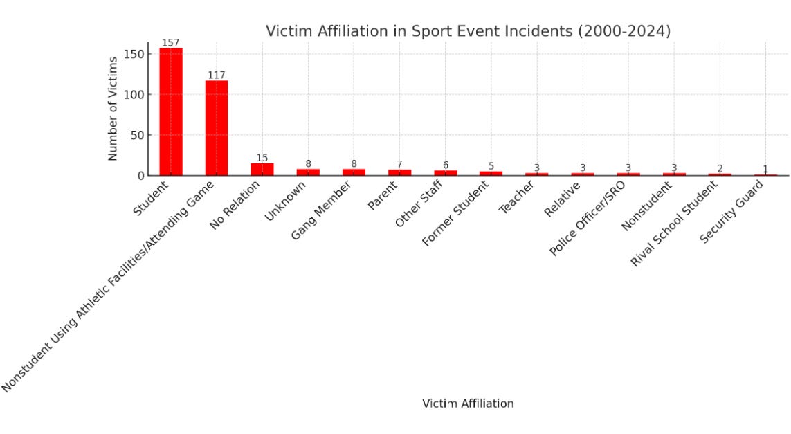 The most common victims are also students and nonstudents attending or using athletic facilities which mirrors the shooter affiliation breakdown. Students, unsurprisingly, were most frequently targeted (or bystanders in the line of fire), followed by spectators or unaffiliated individuals.