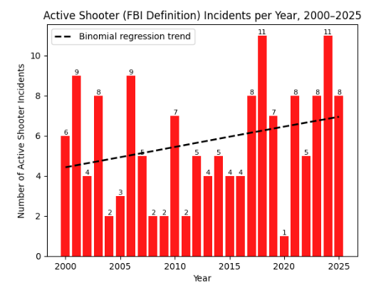 Both the number of incidents and the number of victims continues to decline from the post-COVID peak. My analysis estimates how many shootings and active shooter attacks will happen in 2026.