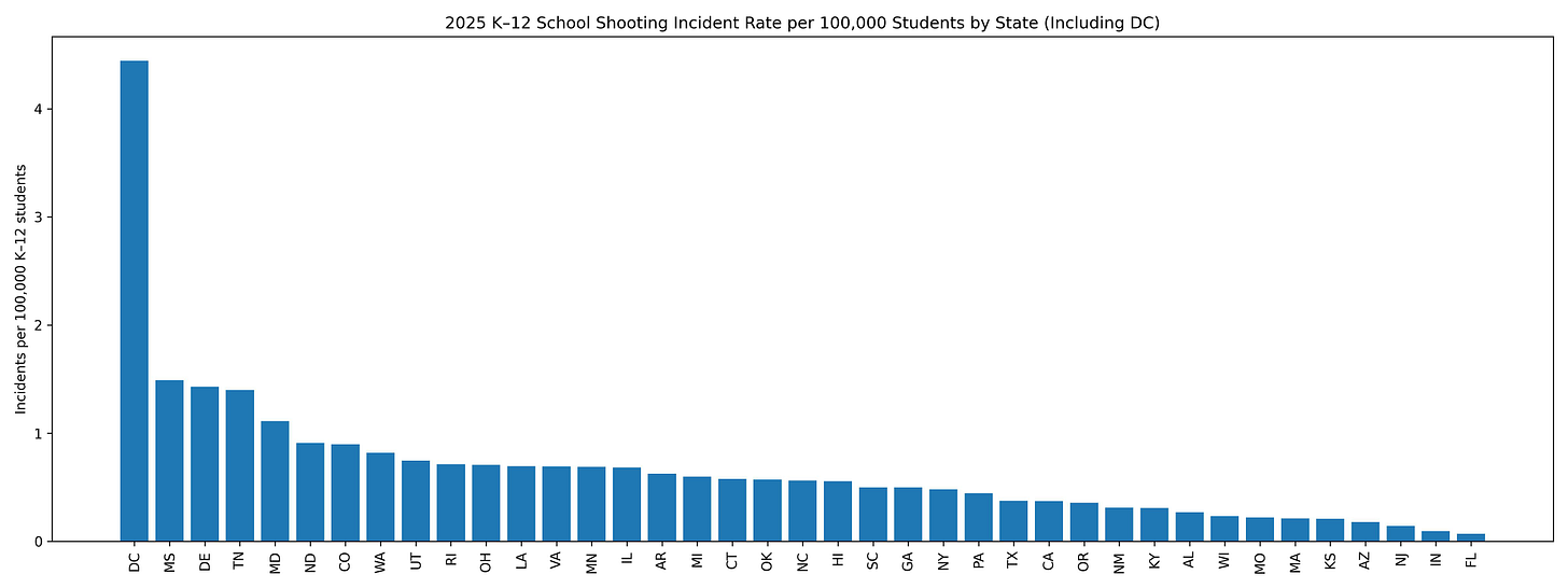 Here is the breakdown by state with the number of shootings in 2025 per 100,000 enrolled k-12 school students. Washington, DC has by far the highest rate of shootings compared to the student population. This makes sense when DC only has 50,839 students enrolled in a city that is a densely populated urban area with a relatively high rate of gun violence.