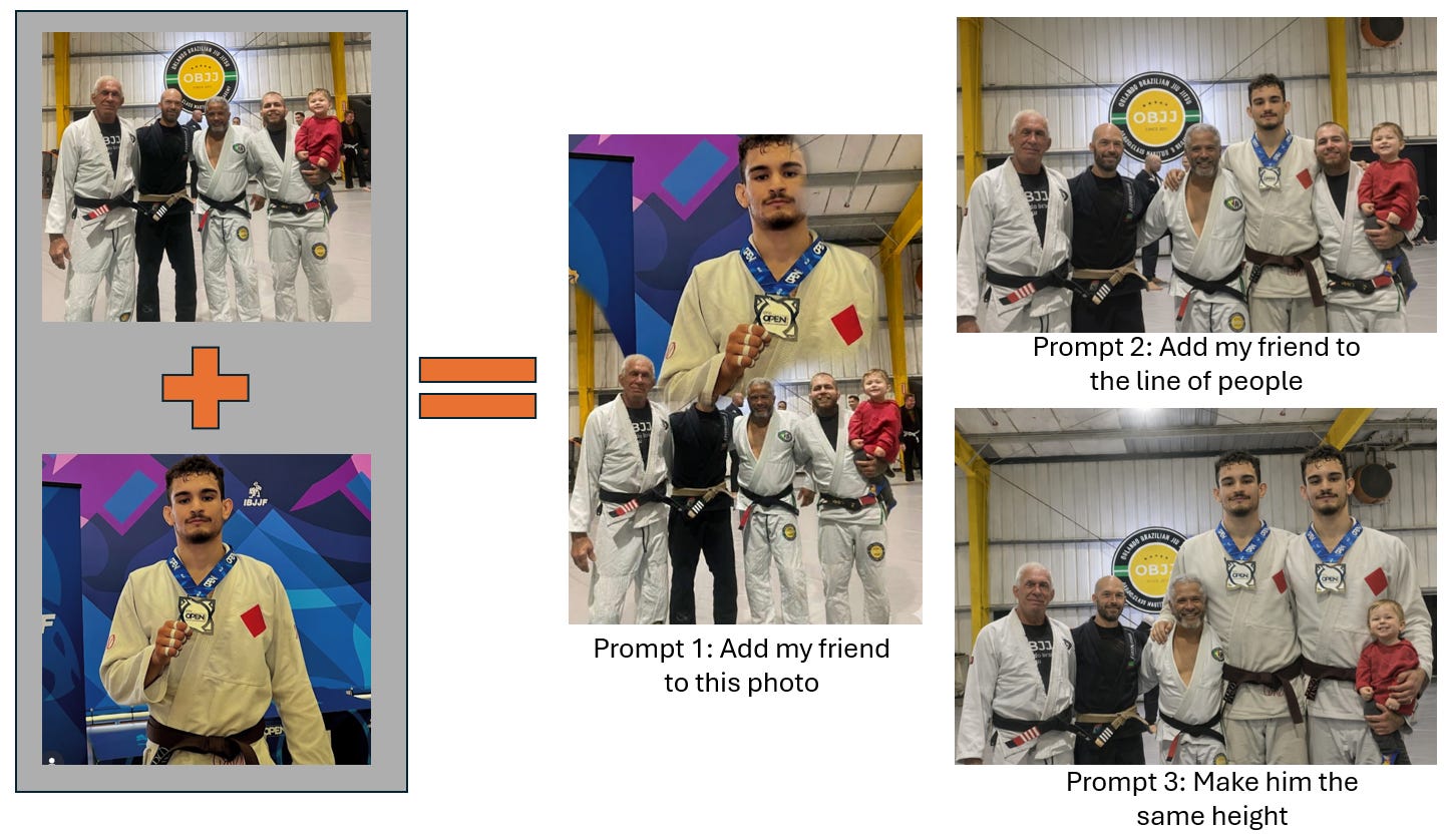 I added more specificity to my second prompt with “add my friend to the line of people and don’t change any faces or features”. The new image generated by the LLM got the group photo concept right but got the scaling wrong as it him 7 feet tall while also changing everyone’s faces.